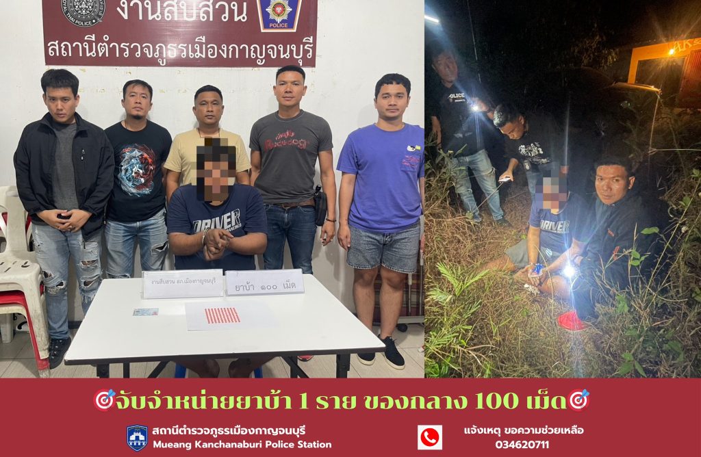 ตร.ชุดสืบสวน เเละ ตร.ชุดปจร. สภ.เมืองกาญจนบุรี ร่วมกันจับกุมตัวผู้ต้องหา “จำหน่ายโดยการมีไว้เพื่อจำหน่ายยาเสพติดให้โทษชนิดร้ายแรงประเภท ๑ (ยาบ้าหรือเมทแอมเฟตามีน) โดยไม่ได้รับอนุญาต”