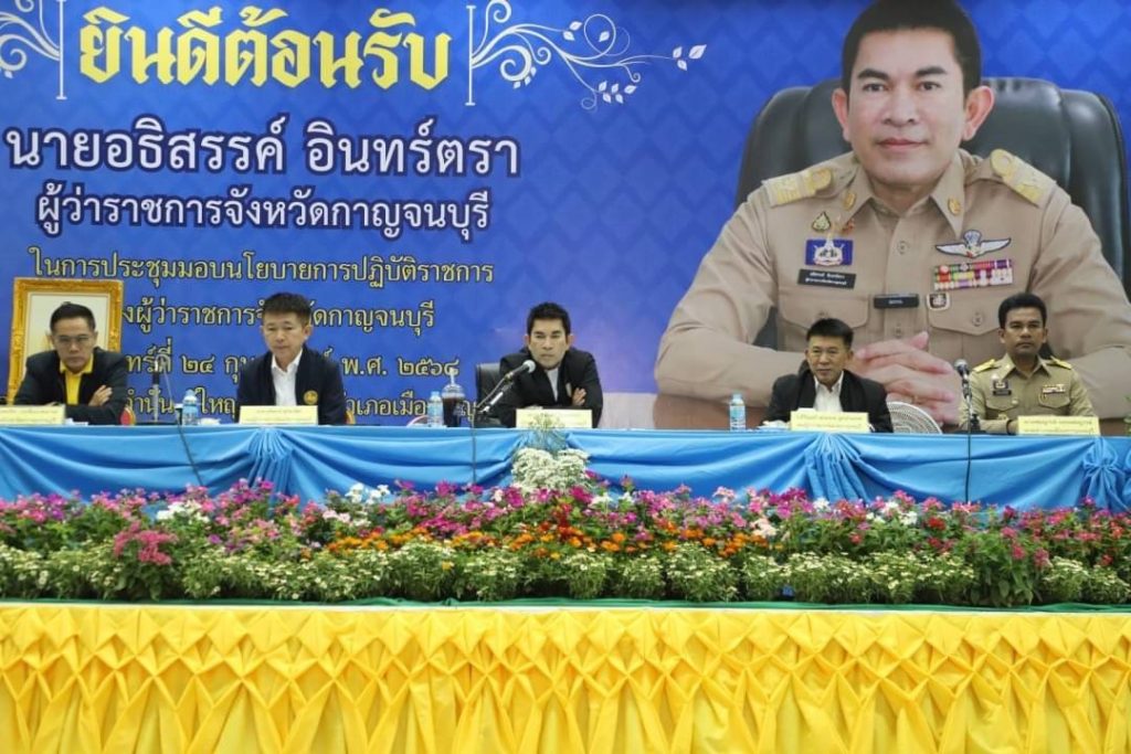 พ.ต.อ. สุรุยทธ เมฆมังกร ผกก.สภ.เมืองกาญจนบุรี รับมอบนโยบายจากนายอธิสรรค์ อินทร์ตรา ผู้ว่าราชการจังหวัดกาญจนบุรี ได้มอบนโยบายและแนวทางการดำเนินงานให้กับส่วนราชการจังหวัดกาญจนบุรี โดยมีวิสัยทัศน์ คือ “กาญจนบุรี เมืองแห่งความสุข” มีเป้าหมายเพื่อให้กาญจนบุรี เป็นจังหวัดที่ประชาชนมีความสุขอย่างแท้จริงในทุกมิติ อีกทั้งเพื่อเป็นต้นแบบของการพัฒนาที่ยั่งยืนในระดับประเทศและระดับสากล โดยคำนึงถึง การพัฒนาจังหวัดกาญจนบุรีให้เป็นพื้นที่ที่ประชาชนมีคุณภาพชีวิตที่ดี ทั้งด้านเศรษฐกิจ สังคม วัฒนธรรม และสิ่งแวดล้อม มุ่งเน้นสร้างสมดุลระหว่างการพัฒนาและการอนุรักษ์ทรัพยากรธรรมชาติ พร้อมทั้งส่งเสริมการท่องเที่ยวอย่างยั่งยืน ซึ่งเป็นจุดเด่นของจังหวัดกาญจนบุรี ซึ่งมีแนวทางสำคัญที่สอดคล้องกับวิสัยทัศน์ เช่นการพัฒนาเศรษฐกิจที่ยั่งยืน ส่งเสริมการเกษตร การท่องเที่ยว และอุตสาหกรรมที่เป็นมิตรกับสิ่งแวดล้อม การสร้างโอกาสทางเศรษฐกิจให้กับชุมชน อีกทั้งการพัฒนาสังคม เพื่อยกระดับคุณภาพชีวิตของประชาชน สนับสนุนการศึกษาและการสร้างสังคมที่ปลอดภัย รวมไปถึงการการอนุรักษ์ทรัพยากรธรรมชาติและสิ่งแวดล้อม โดยรักษาความอุดมสมบูรณ์ของป่าไม้แม่น้ำ และแหล่งธรรมชาติ ส่งเสริมการใช้ทรัพยากรอย่างคุ้มค่าและยั่งยืน และการส่งเสริมวัฒนธรรมและการท่องเที่ยว สืบสานวัฒนธรรมท้องถิ่น และเอกลักษณ์ของชาวกาญจนบุรี เพื่อดึงดูดนักท่องเที่ยวทั้งชาวไทยและต่างชาติผ่านกิจกรรมเชิงวัฒนธรรมและธรรมชาติ สอดคล้องกับประเด็นการพัฒนาของจังหวัด ประเด็นการพัฒนาที่ 4 พัฒนาการท่องเที่ยวสร้างสรรค์