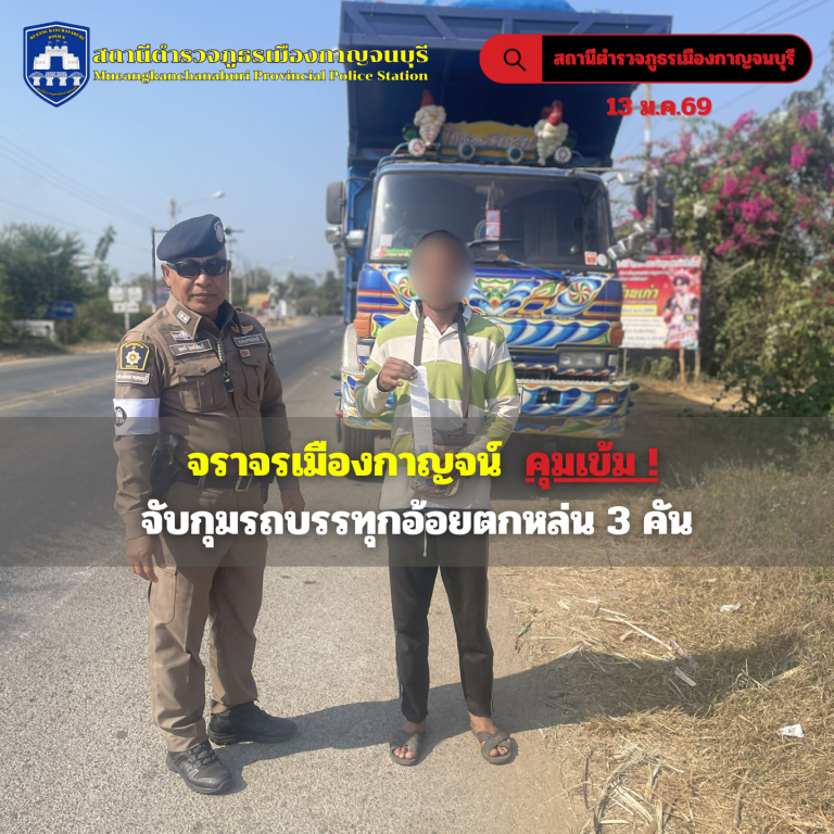 กวดขันวินัยจราจร รถบรรทุก บรรทุกตกหล่นรั่วไหล วิ่งไม่ชิดขอบทางด้านซ้าย ถนน กาญจนบุรี -บ้านเก่า สายตรวจจราจร ได้ จับกุมรถบรรทุก บรรทุก ตกหล่นรั่วไหล ไม่จัดให้มีสิ่งปกคลุม จำนวน3ราย