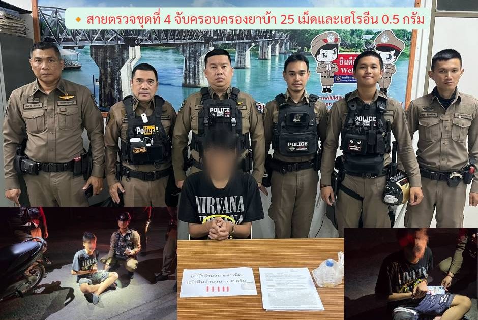 พ.ต.ท.วัชระ ทองดอนโพธิ์ สวป.สภ.เมืองกาญจนบุรี นำทีมงานสายตรวจชุดปฏิบัติการที่ 4 จับครอบครองยาบ้า 25 เม็ดและเฮโรอีน 0.5 กรัม
