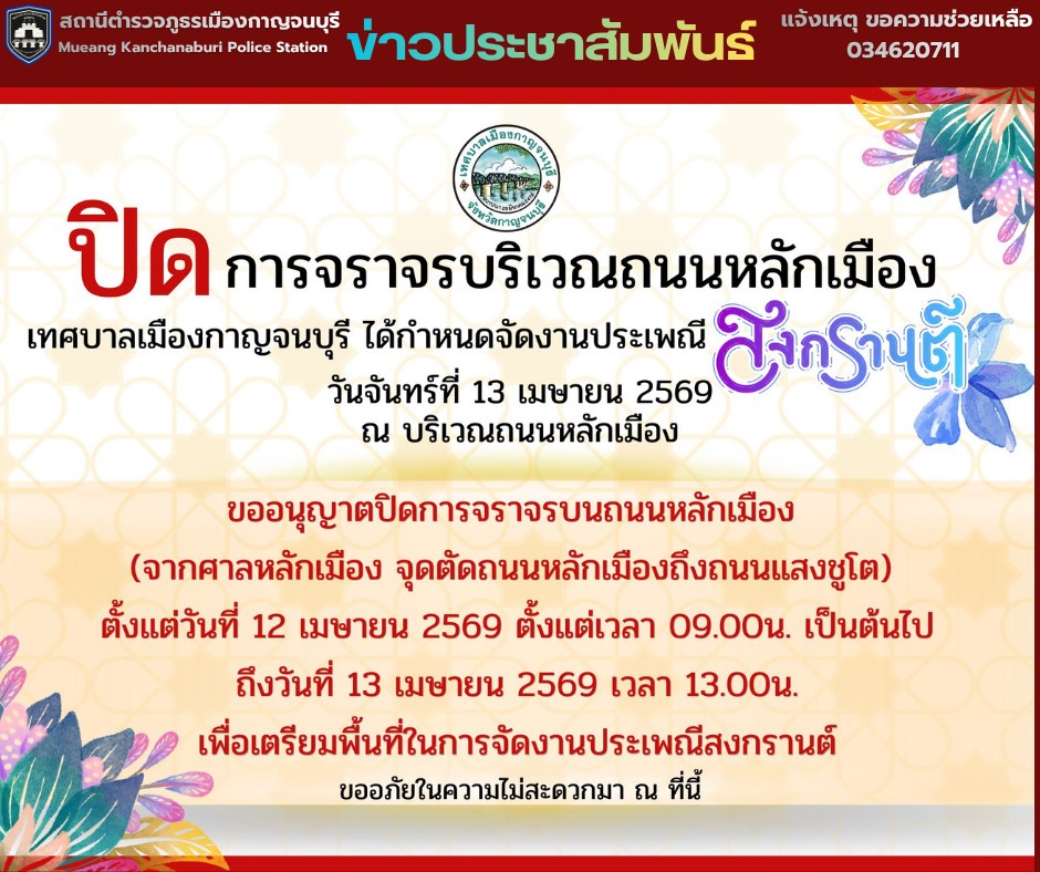 ประกาศ!! ปิดการจราจรถนนหลักเมือง เนื่องจากใช้พื้นที่จัดเตรียมงานประเพณีสงกรานต์ 2569 🙏ขออภัยในความไม่สะดวกมา ณ ที่นี้