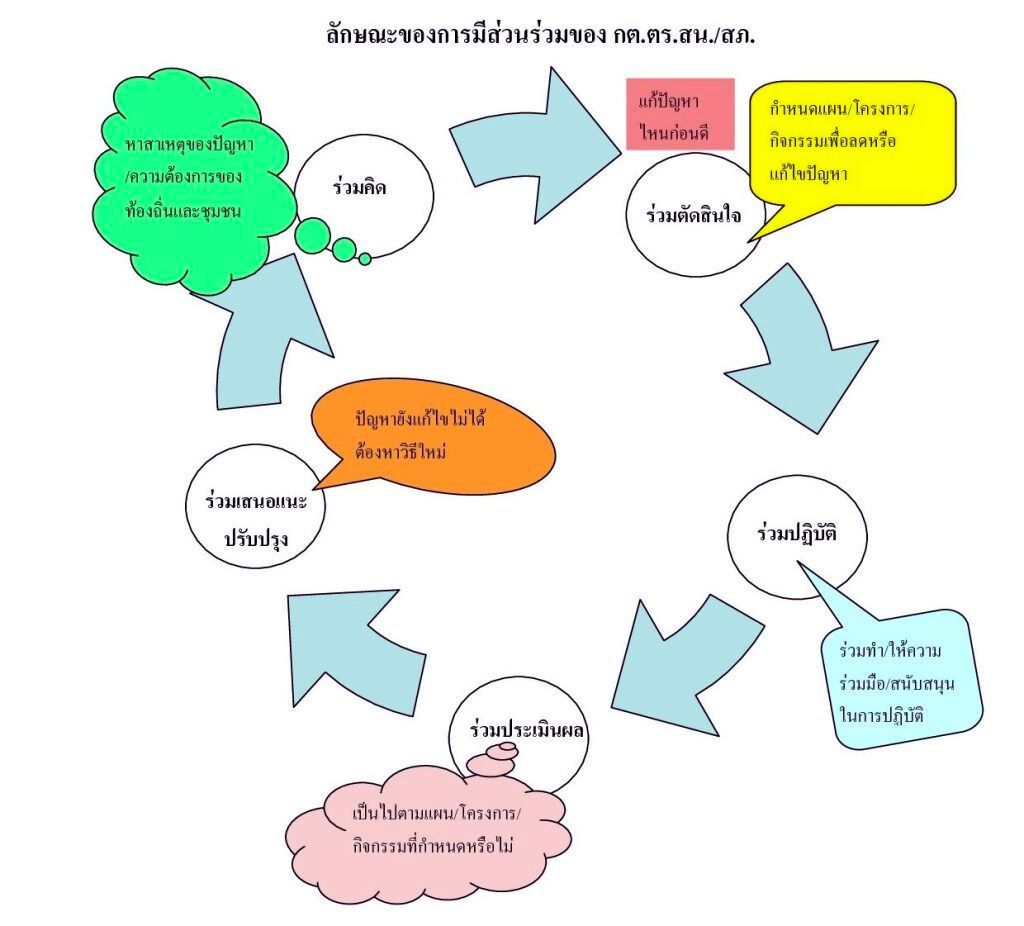 1) มีส่วนร่วมในการคิด ศึกษาและค้นคว้าหาสภาพและสาเหตุของปัญหาตลอดจนความต้องการของท้องถิ่นและชุมชน
