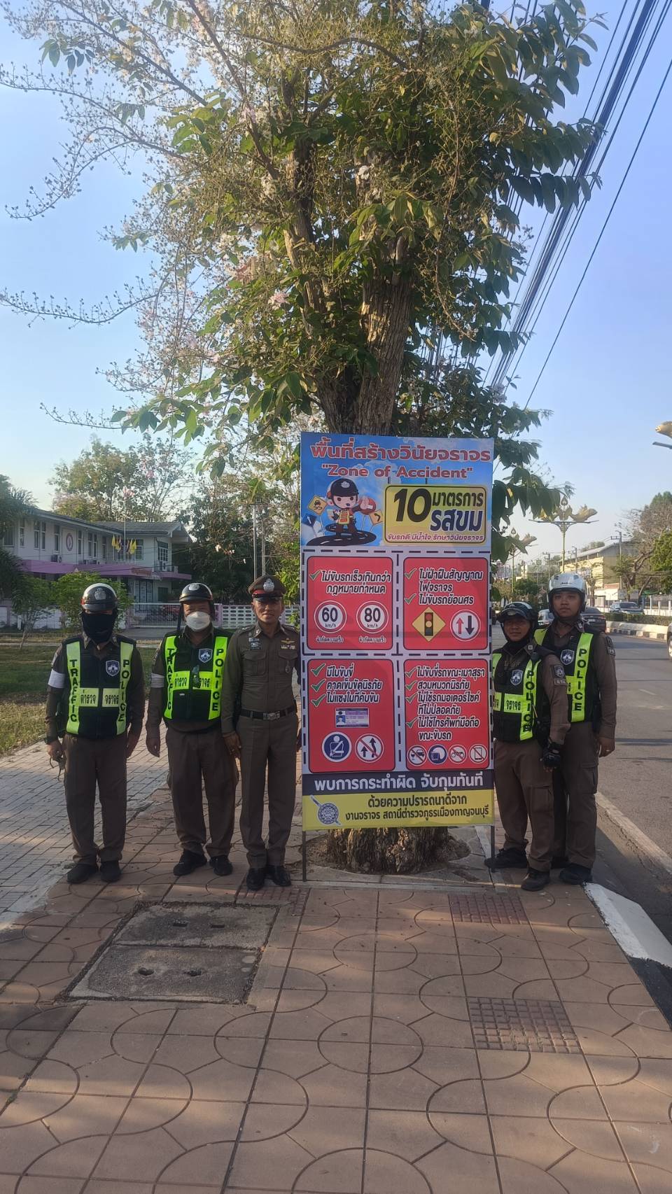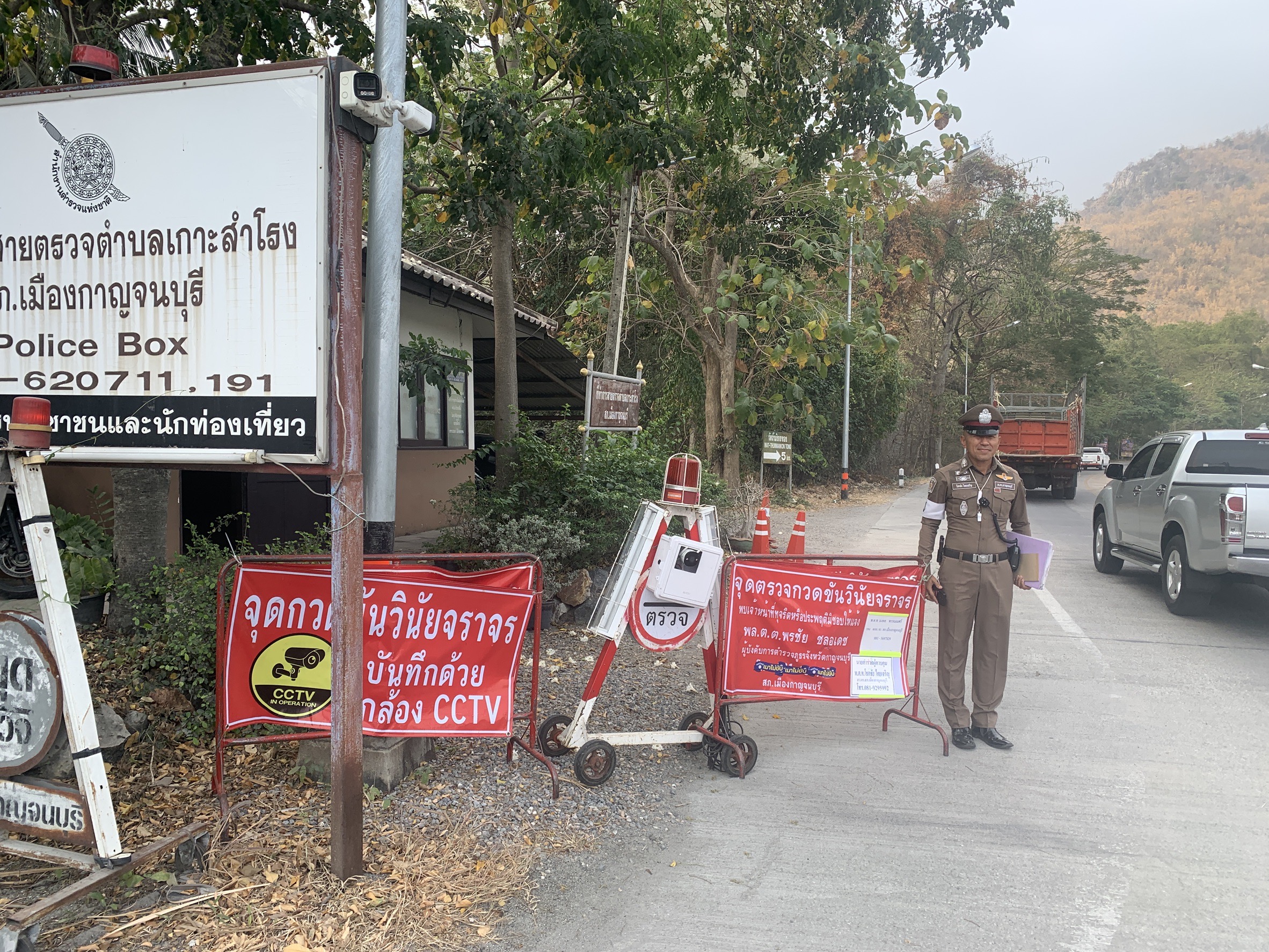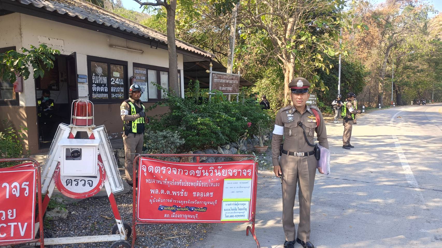 .ต.ท.โชคชัย ไทยเจริญ สว.จร สภ.เมืองกาญจนบุรี ควบคุมการฏิบัติ ได้สั่งการให้ ร.ต.อ.เอกสิทธิ์ เจิมจุล รอง สว.(จร)สภ.เมืองกาญจนบุรี ร้อยเวร 6-0 พร้อมกำลังจราจร จำนวน 10 นาย ร่วม ตั้งจุดตรวขกวดขันวินัยจราจรบริเวณถนนกาญจนบุรี-ด่านมะขามเตี้ย (หน้าจุดตรวจแม่กลอง)